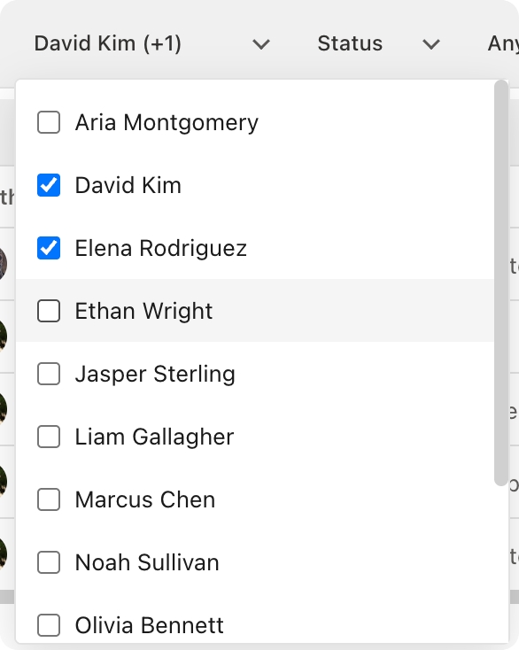 | Status | Multi-select status filter (Active, At Risk, Stuck, Draft) |