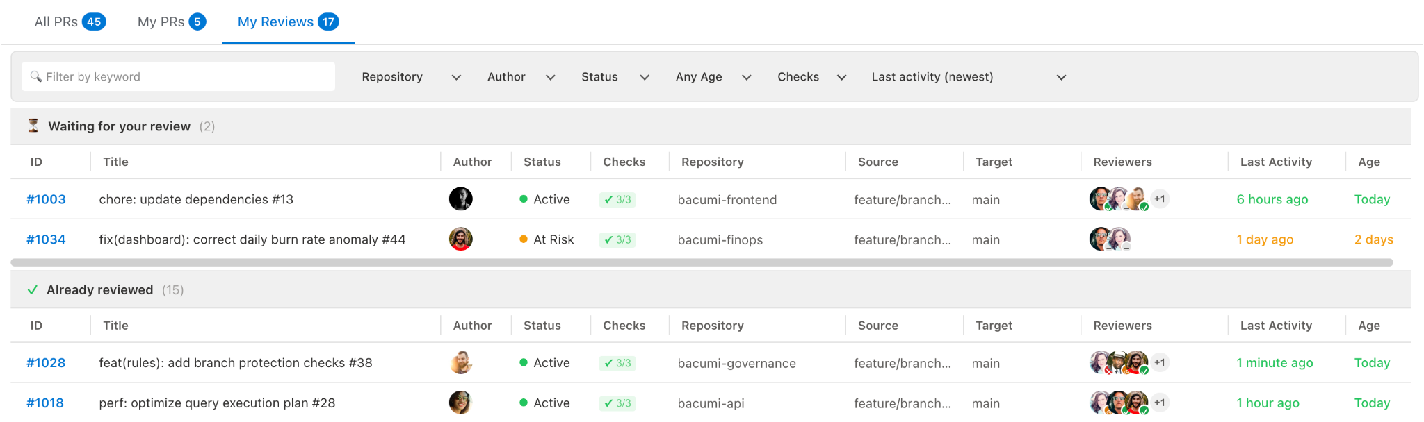 My Reviews shows pull requests where you are listed as a reviewer.